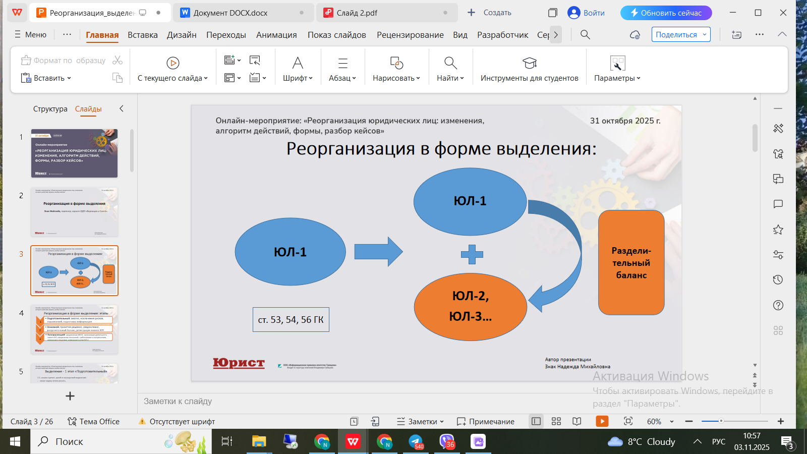 31 кастрычніка партнёр Borovtsov & Salei Надзея Знак у якасці спікера – эксперта прыняла ўдзел у анлайн – мерапрыемстве «Рэарганізацыя юрыдычных асоб: змены, алгарытм дзеянняў, формы, разбор кейсаў».