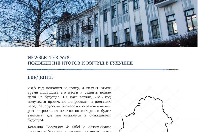 Мы рады представить Вашему вниманию ежегодный Newsletter Borovtsov & Salei за 2018 год, в котором мы выделили наиболее значимые, на наш взгляд, законодательные изменения уходящего года, а также поделились новостями нашей Фирмы и новогодним поздравлением от старшего партнера Василия Салей.